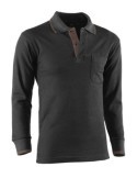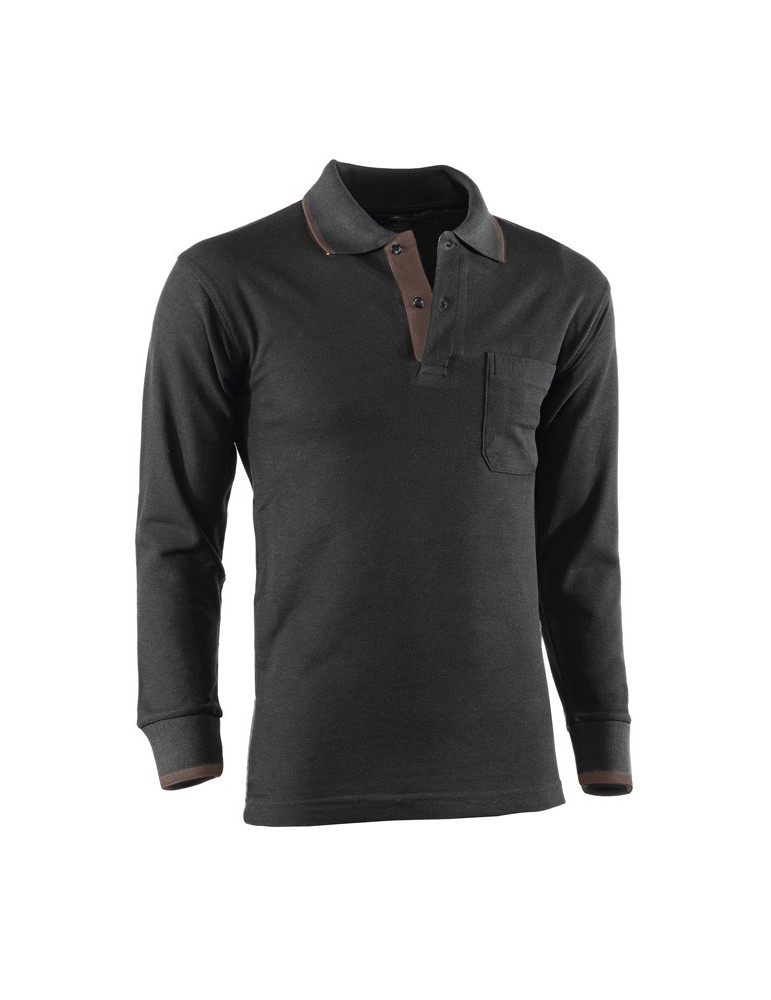 Polo piqué manga larga de 97% algodón y 3% elastano con bolsillo en el pecho. Color Negro con detalles Marrones. Tallas: M,L, XL, y 2XL.