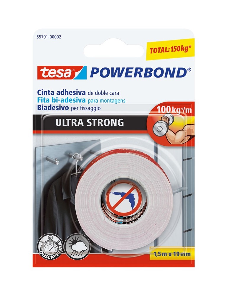 Ideal para su uso en interiores y exteriores. Sujeción fuerte. Soporta hasta 100 kg / m. Fija fuerte en superficies lisas y firmes. Cinta 1,5 m x 19 mm.