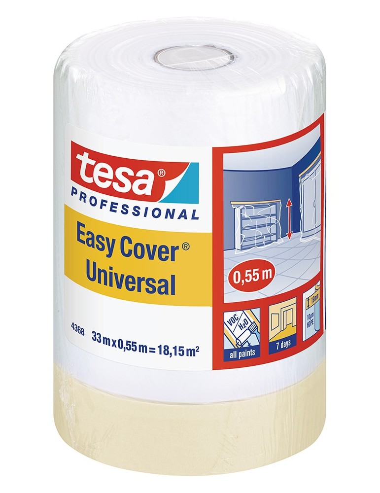 Cubierta protectora de alta calidad para labores de pintura que viene con una cinta adhesiva protectora integrada para una fácil aplicación. Solución 2 en 1 para el enmascarado de grandes áreas en el interior hasta 7 dias. 33 m x 550 mm.