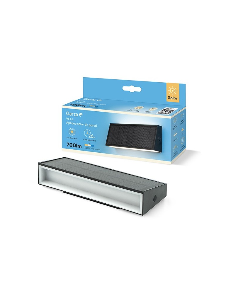 Aplique solar para pared de diseño ultrafino con iluminación dual (superior e inferior). Con sensor crepuscular, luz neutra 4000K, 500 + 200 lúmenes de intensidad y una autonomía hasta 26h.