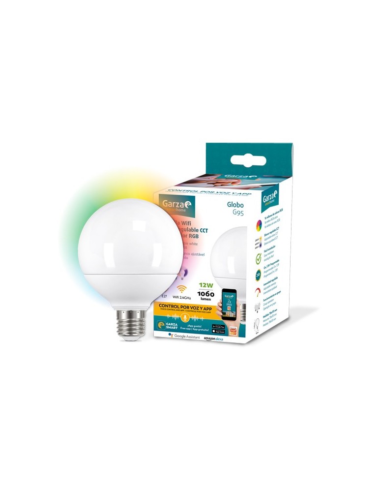 E-27. 12 W. 1060 Lm. Luz cálida, neutra y fría. Te permite seleccionar hasta 16 millones de colores. Regulable en intensidad. Controlable por app y voz. Compatible con Google Home y Amazon Alexa. 9 W. Luz neutra. Controlable mediante app y voz. Compatible con Google Home y Amazon Alexa.