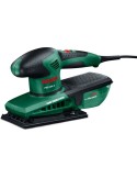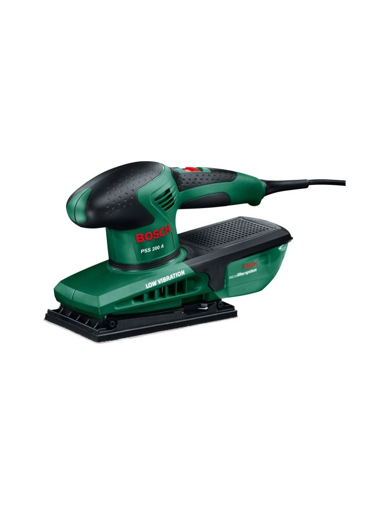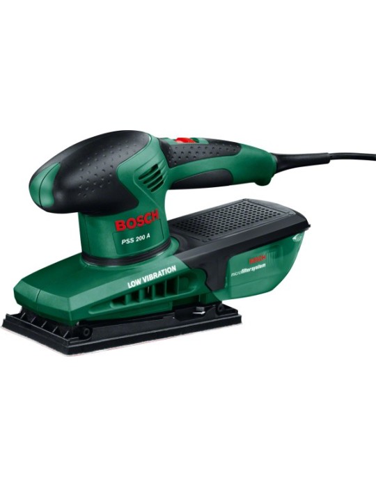 200 W. Sistema microfiltro de Bosch. Empuñadura ergonómica Softgrip. Placa lijadora con cierre de velcro. 3 bandas de lija RedWood. Maletín.