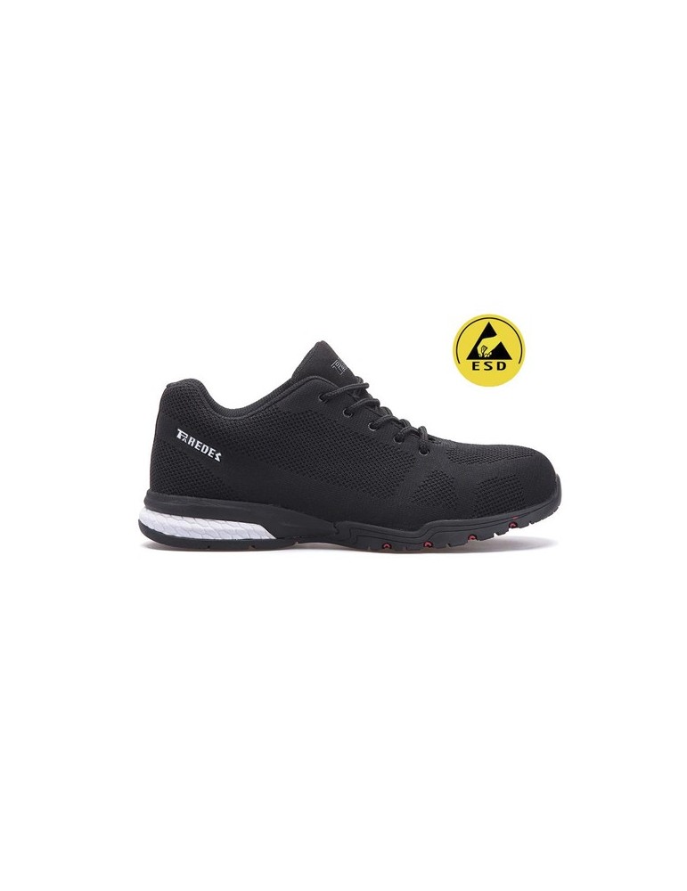 Tiene una forma deportiva. Hecha con un tejido K-nit transpirable y resistente a la abrasión. La suela es de doble densidad con caucho. Forro interior de secado rápido. Un zapato muy flexible y ligero. Color negro. Tallas 38 a 47.