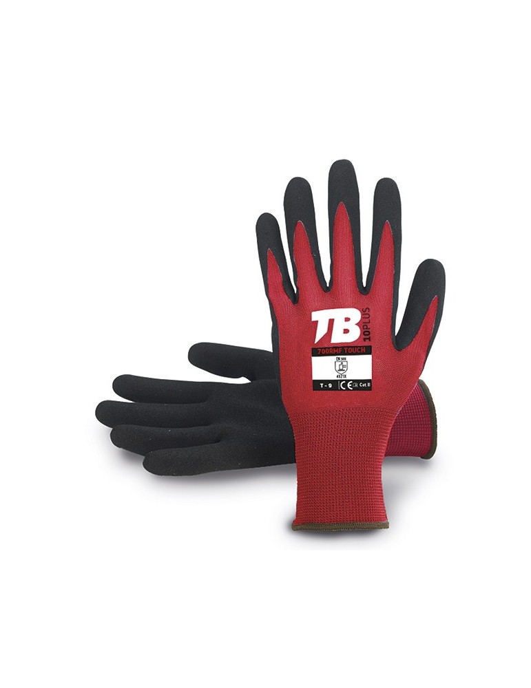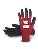 Guante soporte nailon y elastano rojo sin costuras. Recubrimiento nitrilo Sandy grip negro en palma. Puño elástico. Galga 15.