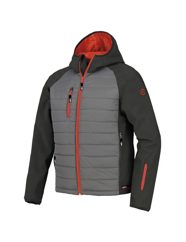 Chaqueta técnica con capucha fija, dos amplios bolsillos frontales, bolsillo porta-documento, dos bolsillos interiores y un ?bolsillo napoleón?. Cordón elástico en la cintura para un ajuste óptimo. Composición: poliéster pongee recubierto e AC y Softshell