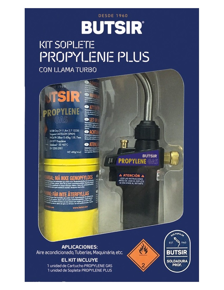 Altas prestaciones + 1 cartucho propylene gas. Rosca 1’. Giro 360º. Consumo 198 gr / h. 2500 W de potencia. Encendido piezoeléctrico.