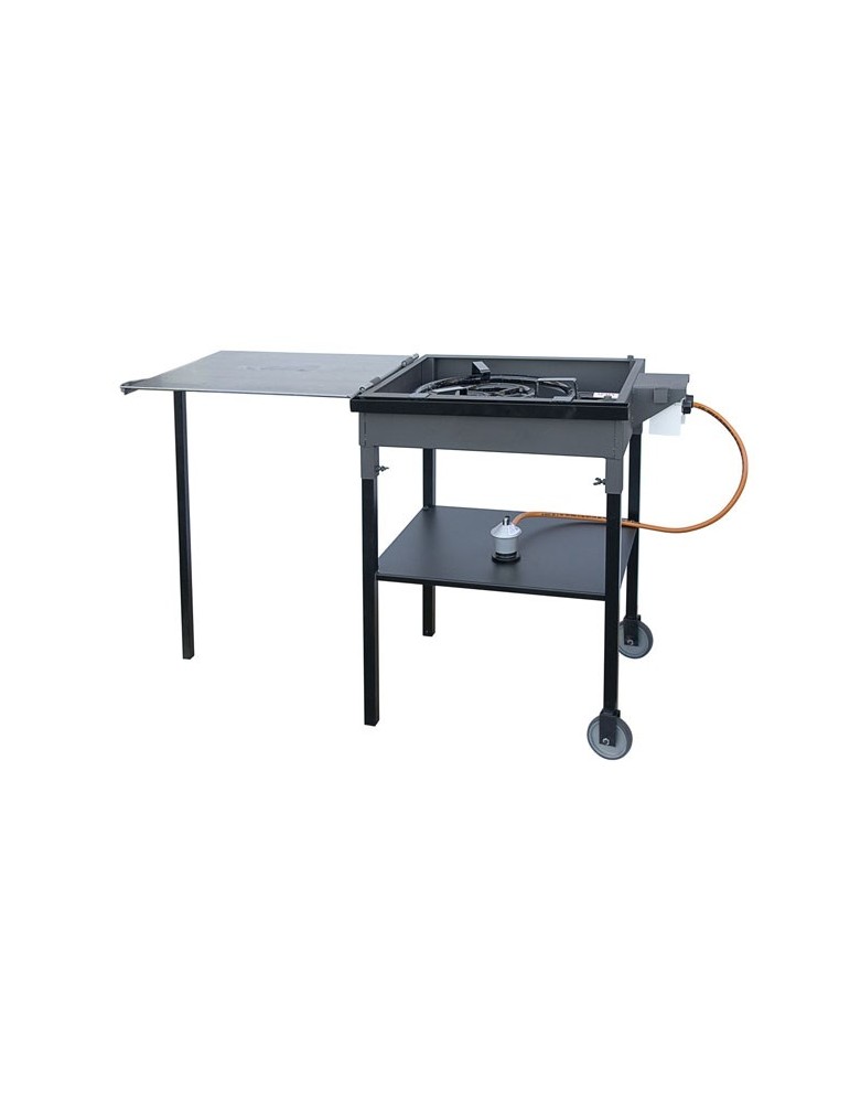 Incluye paellero gas vitrificado de 400 mm, regulador y manguera. Plancha de 4 mm de grueso. Recogegrasas. Bandeja central. 2 ruedas. Peso: 30 kg. Pintura anticalórica. 740 x 530 x 900 mm.